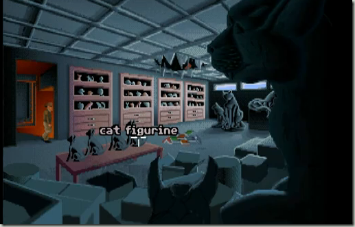 There is one exit, obviously visible but not usable. There are 4 cat statues, and nothing else that can be interacted with. Interacting with any statue gives some flavor text, but nothing else. Only when we interact with statues again, one of them turns out to be a real cat, sending Indy down the coal chute. This introduces the concept of multiple interactions with an object.