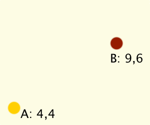 What we need is a movement vector, that is a set of X/Y values to add to A over time. What does this mean? Let's say that our movement vector is 0.6,0.4 just for the sake of the example. That means that after 1 second, A should be at 4.6,4.4. Then, a second later it would be at 5.2,4.8 and so on. The movement vector is called velocity because it doesn't describe a point in space but a magnitude of which a point gets shifted over time.