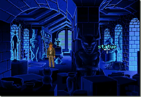 The dialogue lets the player know that Indy is searching for a STATUE in all this JUNK. The emphasis is key here. It encourages the player to look for a statue, and it’s clear that junk refers to the stuff in the room. Now, Indy is referring to a small statue at the end of the intro sequence, but we don’t know that yet. All that we know is that we’re looking for a statue, no idea how big or small or any other details.