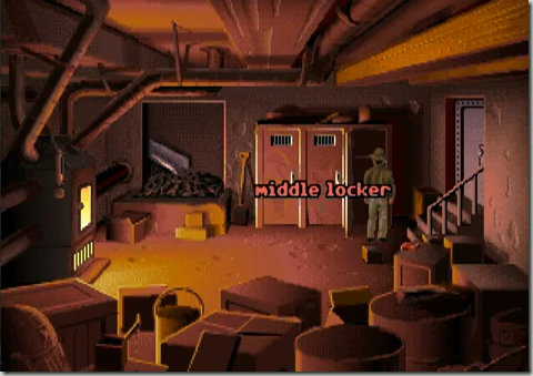 Both exits are blocked: Indy can’t go up the coal chute because it’s too slippery and he refuses to leave through the door without the statue. The new concept introduced in this room is the locker door. Clicking any of the three lockers opens it, and the third locker contains the desired statue.
