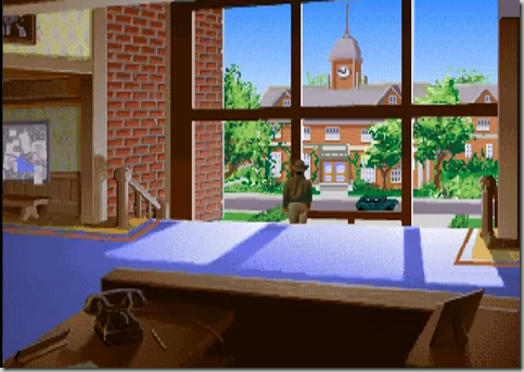 Indy has to travel a bit during the game, and this non-interactive screen simply establishes his current location (Barnett College, which was not stated so far in the game) and signals that you can travel to locations with a red dot.