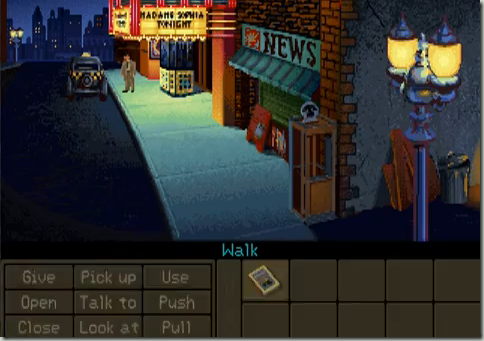 This is where the game begins for real, but it doesn’t just begin. When the screen fades in, we have the scenery on top, which is a familiar interface by now. Below, we have the word “Walk” and nothing else. Only after a few seconds, the verbs and inventory bar fades in.