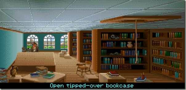 We may need to grab the arrowhead from this room and combine it with the rag from the boiler room so that we can unscrew the back of the library bookcase and get the book. In this case, combining the rag and arrowhead to create a screwdriver is the first use of combining inventory items in the game.