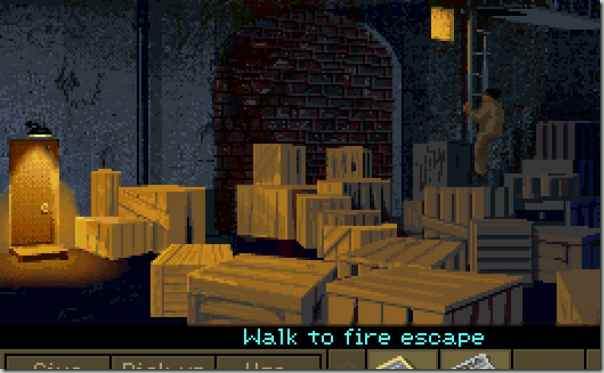 - You can ignore the door and push some crates to gain access to the fire exit ladder.