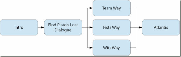 Atlantis has very gradually increased complexity on us, and at this point the player needs to make choices where to go to and quite likely they will run into a few dead ends. What is important is that even though we have 4 locations, there is only one very linear way to go through this, and each location is essentially self-contained.