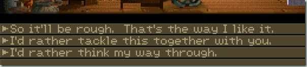This is only a recommendation, the player is free to choose any of the three paths right now. Still, it is remarkable how the game tries to learn about the player and then tailor the rest of the game to them, but without committing at the beginning as to not punish a player that has gotten into the fistfight with Biff by accident or decided that they didn’t like fighting.