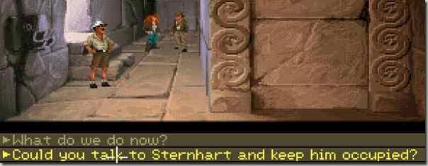 While the concept of multiple characters isn’t new (Maniac Mansion had three, Zak McKracken had four characters), novice players may not be aware that Sophia is more than just an attachment and Tikal allows to find out about this in a very natural way (as Sternhart will always catch Indy when he tries to take the lamp, it feels very natural to ask Sophia for help).