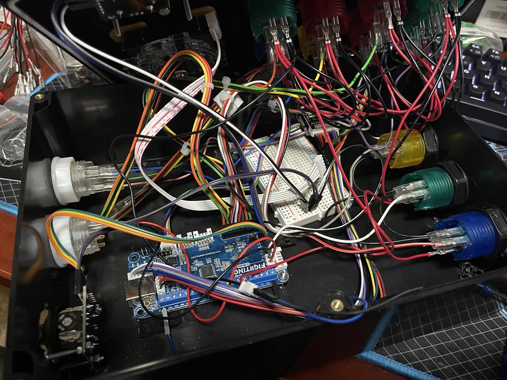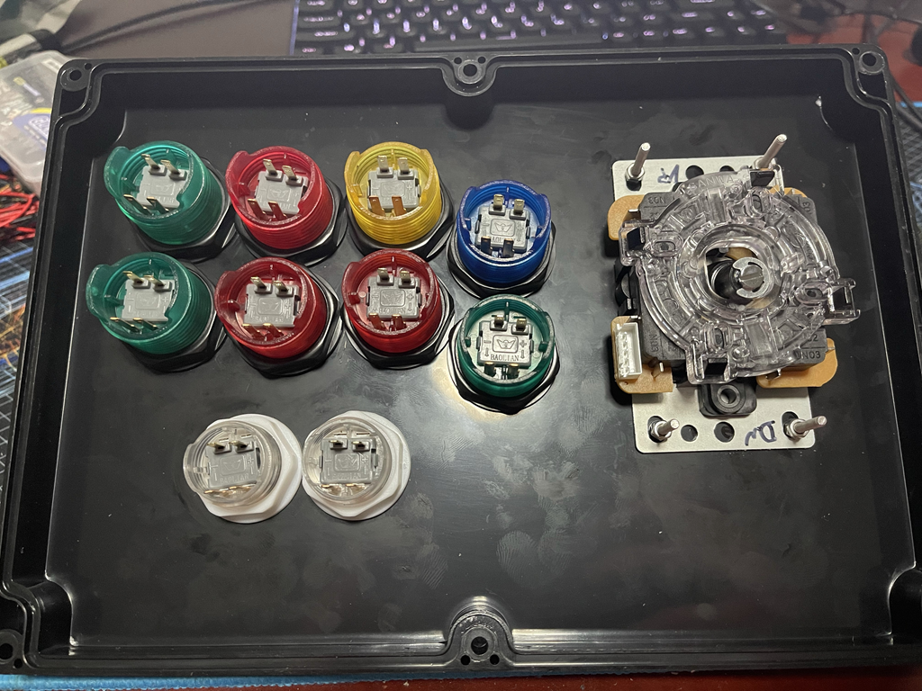 There is no one-size fits all answer, and the hardware can get pretty expensive. I took the easy way out and bought a $40 set on Amazon with a bunch of stuff in it. It’s… not great, the buttons are a bit mushy and sticky, though the levers seem to be authentic Sanwa. It’s a starting point, and the nice thing about buttons is that I can always replace them later with better ones. There’s also a second lever and two zero-delay USB encoders that I don’t need here, but maybe I have use for another project since I have quite a few leftover parts now.