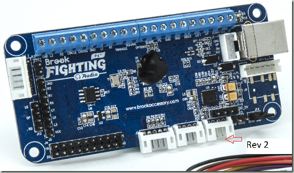 A Rev2 board has those white JST connectors at the bottom. The main product page shows the correct pinouts, but you’ll be going back and forth between the product page and user guide a bit. Not sure if other fighting boards have similar documentation issues.
