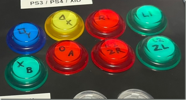 The buttons that I have allow me to remove the top and write on the actual button, which is that I did – top left is Playstation, bottom right is Switch, and the Color coding is for the Xbox, which many Windows games use.