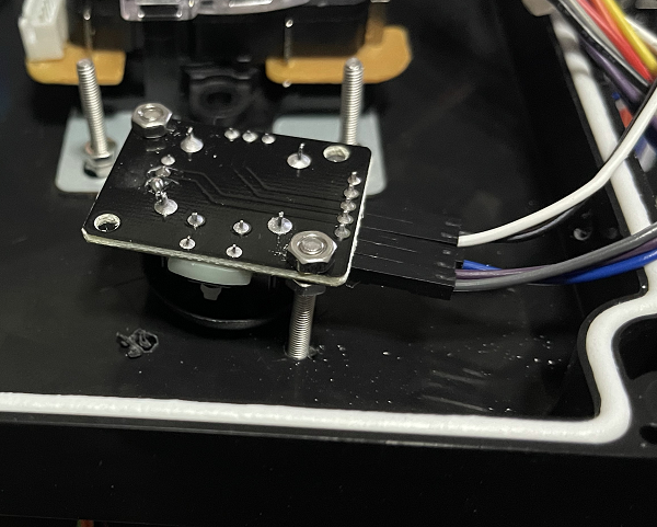 Here’s where I made some more mistakes. I drilled a large hole for the stick, then some smaller holes to mount M3 bolts to hold the board. The problem is that if the stick is too close to the hole, it would scrape the case. I didn’t have long enough bolts to really get an overly stable mount, as the nuts are at the very end of the bolt. (This photo doesn’t show a third nut at the bottom where the bolt is held into the case.