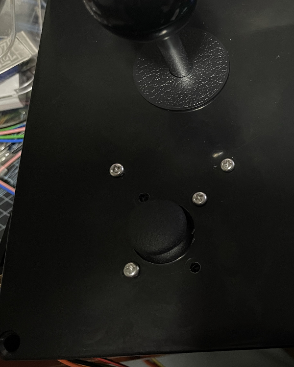 I mounted the right analog stick under the main joystick, which is a pretty good position since my hand is well to the left of it. The left analog stick is mounted on the right side of the stick – I don’t really need it all that often. I did mess up the hole spacing on that left stick and had to expand it with some side cutters. Yeah, “Measure twice, cut once” and all that, but oh well – I knew this would be a learning exercise.